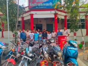 संक्षिप्त विवरण इस प्रकार है जिले में मोटरसाइकिल चोरी की घटनाएं अत्यधिक होने पर वरिष्ठ पुलिस अधीक्षक पारुल माथुर द्वारा चोरी की घटनाओं पर अंकुश लगाने के लिए अलग-अलग टीमों का गठन किया गया था इसी दौरान मुखबिर से सूचना मिला की उपरोक्त आरोपी यान अलग-अलग स्थानों में मोटरसाइकिल बेचने की फिराक में है जिसकी सूचना वरिष्ठ पुलिस अधीक्षक महोदय को दी गई जिनसे कड़े निर्देश प्राप्त होने पर अतिरिक्त पुलिस अधीक्षक शहर उमेश कश्यप एवं नगर पुलिस अधीक्षक श्रीमती स्नेहिल साहू के मार्गदर्शन में थाना प्रभारी कोतवाली प्रदीप आर्य एवं क्राइम ब्रांच टीम द्वारा एक साथ अलग-अलग स्थानों पर रेट कार्रवाई की गई जिस पर उपरोक्त आरोपियानो को घेराबंदी कर पकड़ा गया आरोपियों के कब्जे से 11 नग मोटरसाइकिल 1 नग फ्रीज 3 नग गैस सिलेंडर अलग-अलग स्थानों से जप्त किया गया उपरोक्त आरोपियों को विधिवत गिरफ्तार कर माननीय न्यायालय के समक्ष पेश किया गया