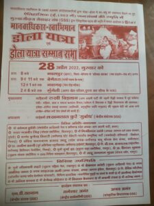 यह कार्यक्रम नवलपुर बेमेतरा से वाया नवागढ़ मुंगेली तक रोड शो किया जाएगा। जिसमें महिला सम्मान के प्रति (जिसमें सामंतवादी ताकतों में महिलाओं को डोली में बैठने से रोका जाना प्रचलन में था) अंधविश्वास को दूर कर समाज में समान रूप से पुरुषों के साथ महिलाएं कंधे से कंधा मिलाकर चलने के लिए कदम बदाएंगे।