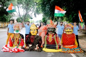 बिलासपुर.. Cgatoznews..आजादी के 75 वे अमृत महोत्सव में आज बिलासपुर की संस्था कठपुतली एवं नाट्य कला मंच किरण मोइत्रा द्वारा संचालित आज हर घर झंडा घर घर झंडा अभियान के तहत आज टीम के सदस्यों के साथ एवं शहर के बच्चो और नागरिकों के बीच झंडा फहरा कर इस अभियान को आगे बढ़ाया ,,किरण मोइत्रा द्वारा इस विलुप्त होती कठपुतली कला को बचाने ,,और संरक्षण के लिए लगातार कोशिश की है टीम के सदस्यों का साथ हमेशा