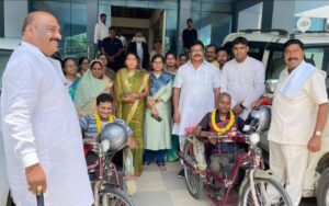 बिलासपुर -:- cgatoznews…जिला पंचायत कार्यालय में अध्यक्ष अरुण सिंह,सभापति अंकित गौरहा ने सादगी भरे कार्यक्रम के दौरान दो दिव्यांगों के बीच आटो ट्रायसायकल का वितरण किया। ट्रायसायकल मिलने के बाद दिव्यांग दोनो व्यक्तियों ने खुशी जाहिर कीय। इस दौरान दोनों दिव्यांग व्यक्तियों के आंख से खुशी के आंसू छलक उठा। हितग्राहियों ने बताया कि जीवन बहुत ही कठिन गुजर रहा था। आटो सायकल मिलने के बाद जिन्दगी थोड़ी आसान हो जाएगी। साथ ही अन्य योजनाओं का भी लाभ मिलेगा।