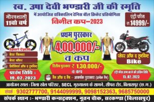बिलासपुर। Cgatoznews.…मध्य भारत की सबसे बड़ी विनीत कप का आज से आगाज होगा। स्व. उषा देवी भंडारी की स्मृति में अखिल भारतीय रात्रिकालीन टेनिस बॉल क्रिकेट प्रतियोगिता विनीत कप-2023 का आयोजन सीपत रोड, एसईसीएल मुख्यालय के सामने खेल परिसर में हो रहा है।