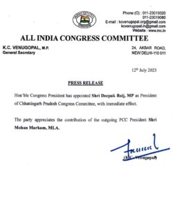 ब्रेकिंग- छत्तीसगढ़ विधानसभा चुनाव से पहले कांग्रेस ने किया बड़ा फेरबदल, दीपक बैज बने छत्तीसगढ़ के नए पीसीसी चीफ