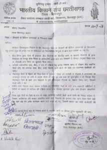 बिलासपुर जिले में किसानों को हो रही समस्याओं के विषय मे भारतीय किसान संघ के जिलाध्यक्ष धीरेन्द्र दुबे के नेतृत्व में जिला कलेक्टर (द्वारा सिटी मजिस्ट्रेट नारायण प्रसाद गबेल)को ज्ञापन सौंप गया एवम मांग किया गया कि किसानों की समस्याओं का शीघ्रता से निराकरण किया जाए ताकि किसान इन सब परेशानियों से दूर होकर निर्विघ्न भाव से अपना कार्य कर सके ।