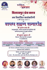 बिलासपुर। शहर के पत्रकारिता जगत में 20 फरवरी को एक महत्वपूर्ण आयोजन होने जा रहा है। बिलासपुर प्रेस क्लब की नव निर्वाचित कार्यकारिणी (2025–2027) का शपथ ग्रहण समारोह शुक्रवार को दोपहर 12 बजे ग्रैंड अम्बा होटल, पुराना बस स्टैंड रोड में आयोजित किया जाएगा। इस गरिमामय समारोह में छत्तीसगढ़ शासन के उपमुख्यमंत्री एवं नगरीय प्रशासन तथा लोक निर्माण मंत्री अरुण साव मुख्य अतिथि के रूप में शामिल होंगे और नई टीम को पद एवं गोपनीयता की शपथ दिलाएंगे।