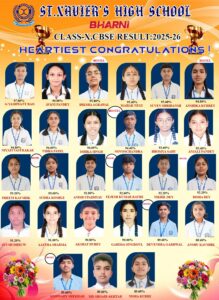 केंद्रीय माध्यमिक शिक्षा बोर्ड (सीबीएसई) द्वारा घोषित कक्षा 10वीं के परीक्षा परिणाम में सेंट जेवियर्स हाईस्कूल, भरनी के छात्रों ने उत्कृष्ट प्रदर्शन कर स्कूल का नाम रोशन किया है। इस वर्ष के परिणामों में विद्यार्थियों ने शानदार अंक हासिल करते हुए एक नया कीर्तिमान स्थापित किया है।